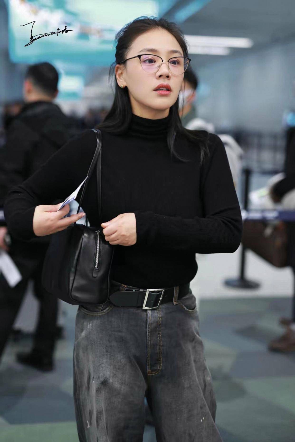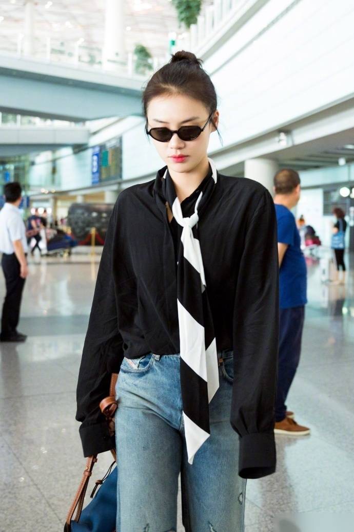 仔细看这套“显瘦神装”,玄机可不止在衬衫本身。马思纯选的是oversized版型,宽松的衣摆巧妙遮住了腰腹赘肉,而自带的黑白条纹围巾打个随性结,不仅打破黑色沉闷感,更在视觉上纵向拉长颈部线条,完美转移了对肩宽的注意力。下装搭配Diesel直筒破洞牛仔裤,高腰设计提升腰线,宽松裤腿藏住小腿肌肉,再踩上Celine白色短靴延伸腿部线条,整套搭配简直是“五五分身材”的救星。难怪有网友调侃:“这哪是穿衣服,分明是在玩视觉魔术!”